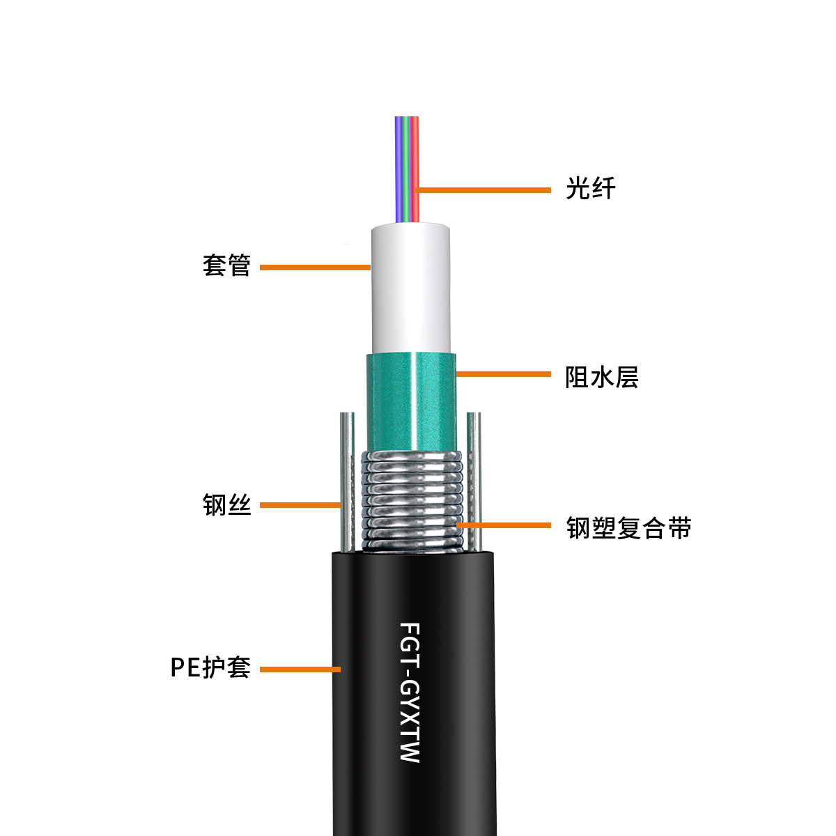 金屬加強(qiáng)構(gòu)件夾帶鋼絲的鋼——聚乙烯結(jié)護(hù)套中心束管式全填充型通信用室外光纜。